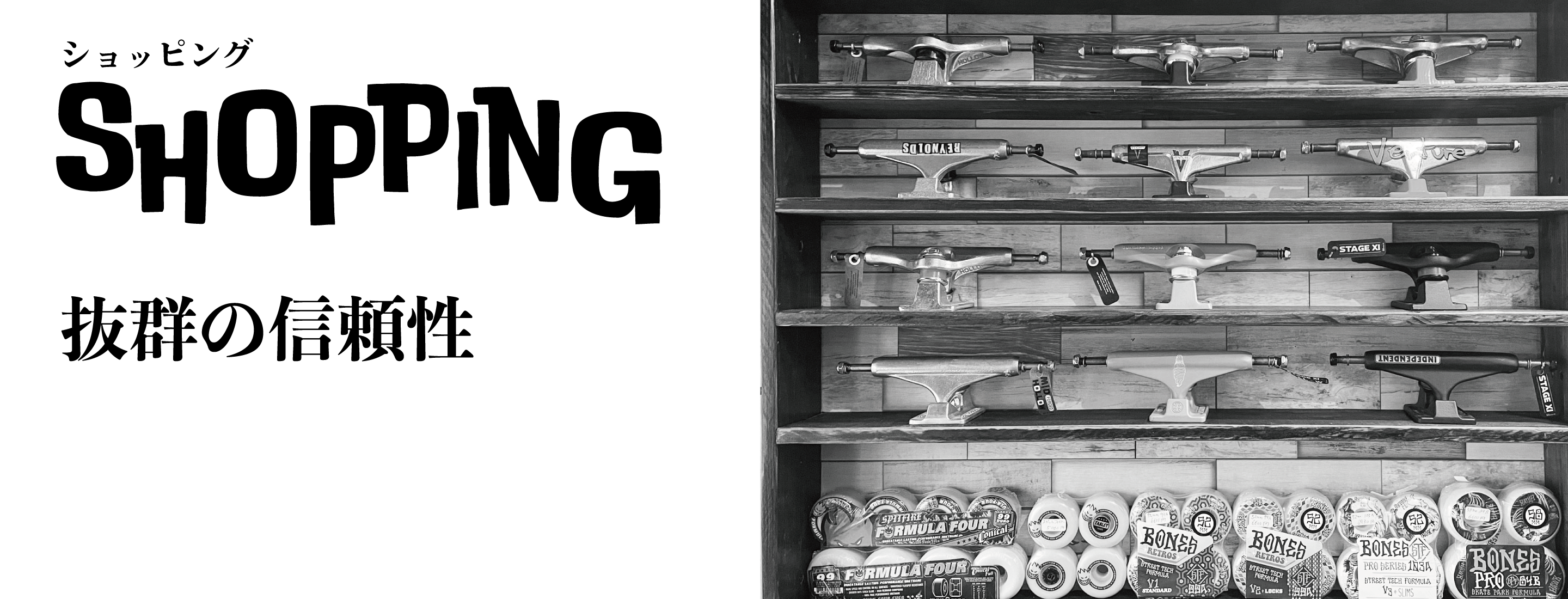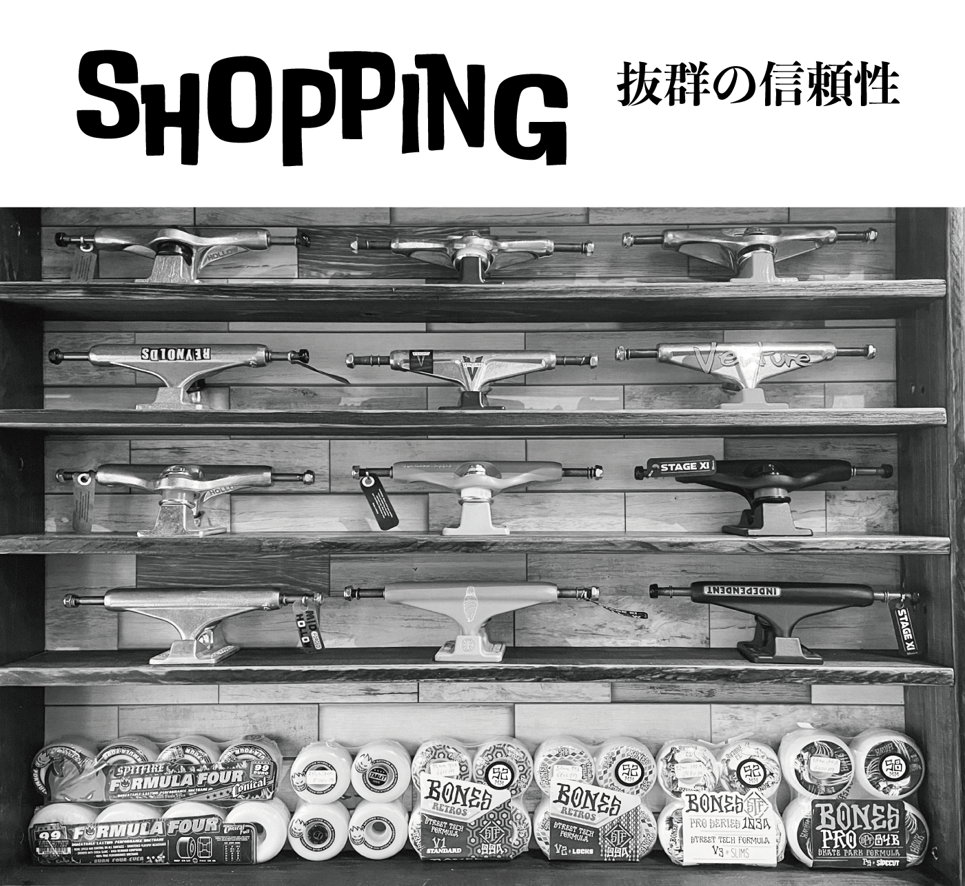 スケートボードの品質を左右する一番の要素は足回りです。デッキとウィール(タイヤ)をつなぐ金属部分はトラックと言い曲がる役割があります。トラックとウィールをつなぐ場所にはベアリングがありますが、高性能なものほど精密、頑丈に作られているため価格も高くなります。つまり、足回りの性能が良いほど気持ち良く滑る事ができるのです。各パーツの組み合わせで〝乗り味〟が決まります。
