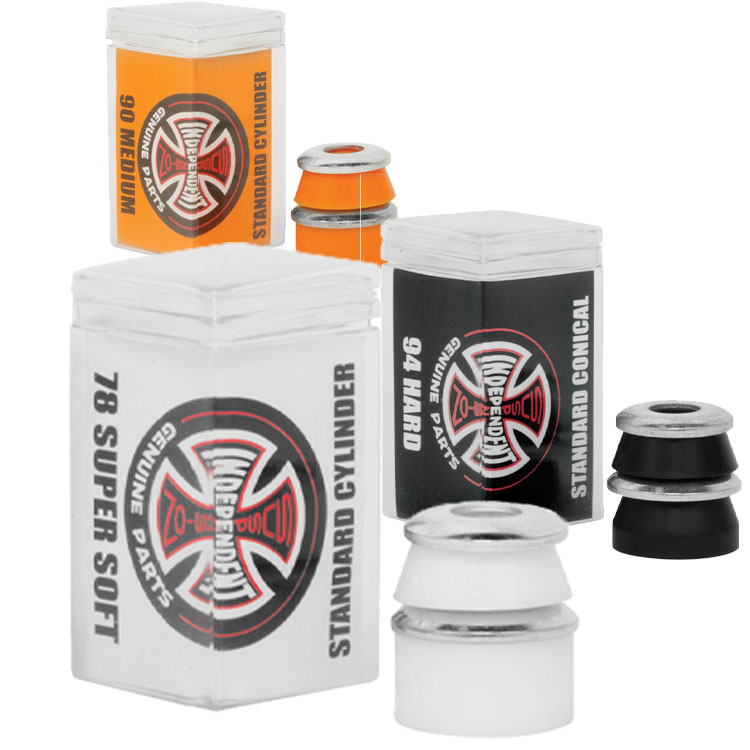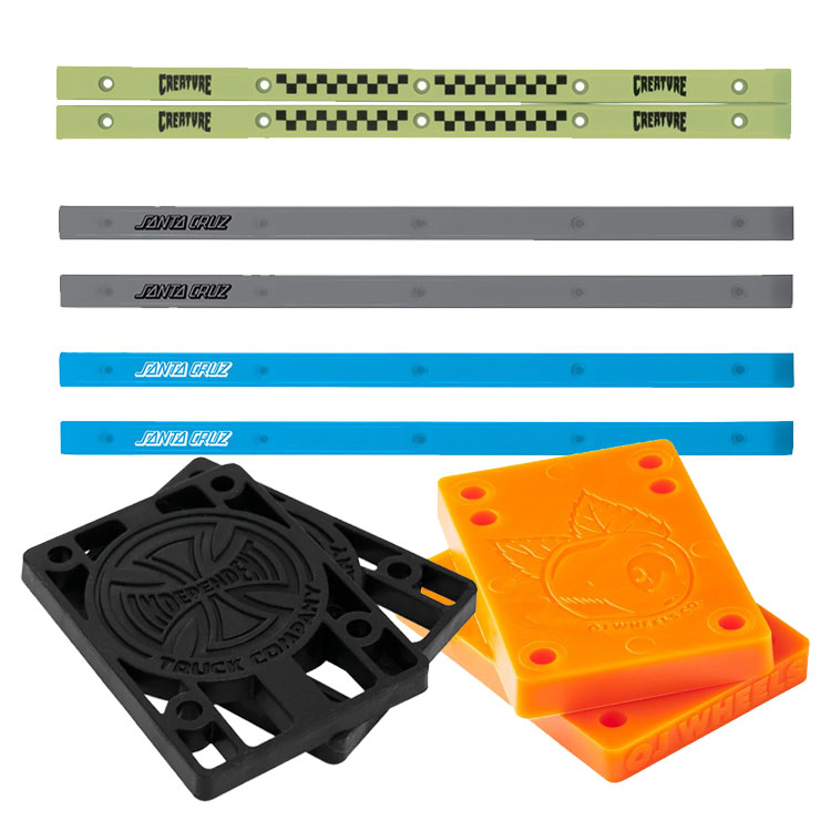上記以外にスケートボードを構成するパーツとして忘れてはいけないものがあります。それが組み立ての際に必要となる〝ネジや、乗り味を簡単に変える事ができる〝ブッシュ〟(トラックの曲がり具合を決める部分)大きなウィールに合わせて車高調整を行う〝パッド〟や〝レールバー〟など、自分のスケートボードをよりカッコよくカスタマイズできる様々なアイテムがあります。細かな所まで自分のこだわりを反映させる事ができる奥深さを是非、お楽しみください。